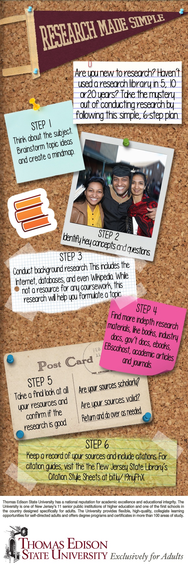 For more assistance on how to start your research, how to search online databases for articles, citing your sources, general writing guides and more, visit the New Jersey State Library's Information Literacy for TESU Students website.